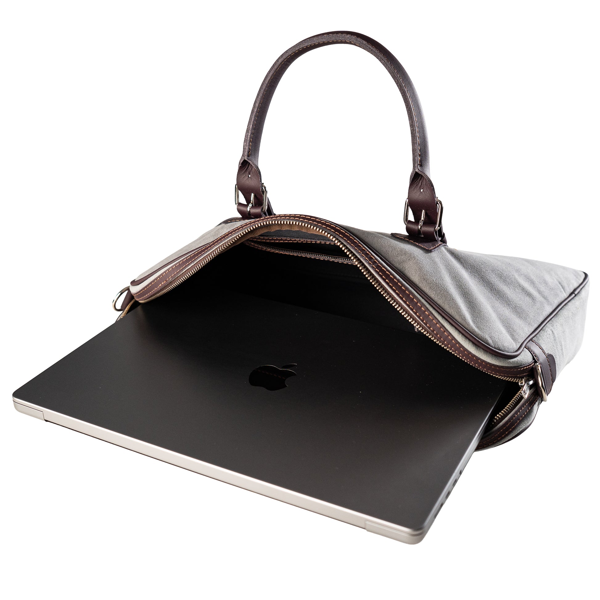 Moderna laptop torba u sivoj boji, izrađena od alkantare i prirodne kože za savršen balans između elegancije i praktičnosti.